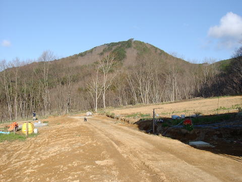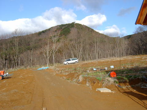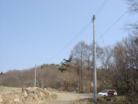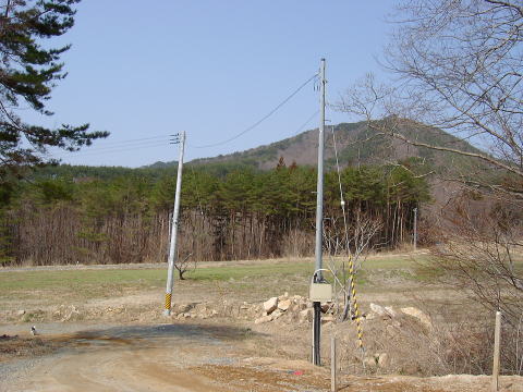 奥のが東北電力の最終柱で、手前がこちらの私設最終ポールである。 ここから宅地には埋設で引き込む。 ちなみに、バックは矢岳山で、緑色に見えている土地は、首都圏在住の人が購入し、数年後には移住するとのこと。 |