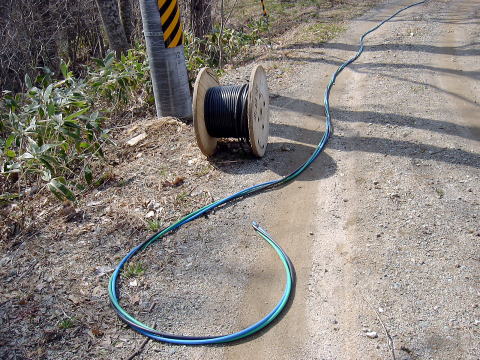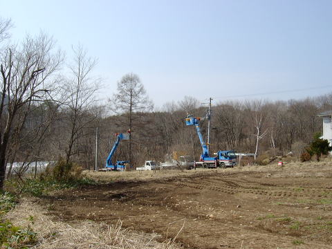 そのため、以前から東北電力に改善を申し込んでいたが、さしあたり多少の改善のため、東北電力分の引込み線を60スクエアに変えるとのことで、工事会社が来て、村道沿いのトランスのある電柱から電力の最終柱まで、電線を張り替えた。