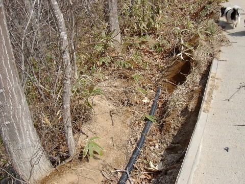黒い管が見えるが、他に通信関係と予備管が埋まっている。 見えている管が一番太く、電力線60スクエアが3本入っている。 |