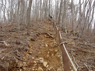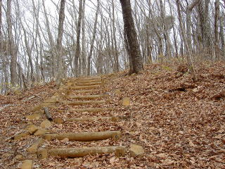 ピークから少し降り鞍部に出て、又階段を登る。 かなりきつい登りで、今年初めての登山の身 には結構つらい。 |
