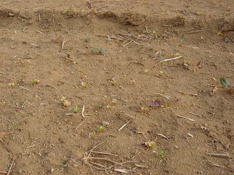雑草もだいぶあるので判りにくいが、黄緑色のものが蕎麦の芽である。 下記の写真参照。 |