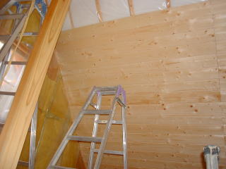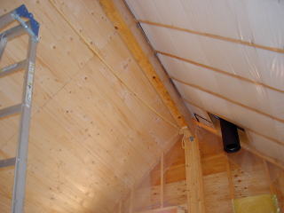 | 少し厚めのポリエチレンシート(#150 1800*50m)をホームセンターで購入し、天井の断熱材の下にタッカーで張っていく。 | 東側の天井板を張り始めた。 (南側から撮ったもの) |
