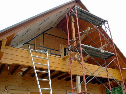 | 北側に足場を作った ここに見えるロフト部分の右側の窓2つは、明り取り用天窓を取り付けるかわりに追加したも。 この窓は、換気も兼ねている。 |